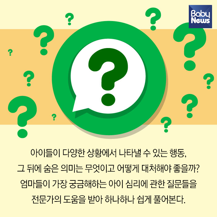 ¾ÆÀ̰¡ ÀÌÀ¯ ¾øÀÌ Â¥ÁõÀ» ³»°Å³ª ½Å°æÁúÀ» ºÎ¸®´Â µî ÀÌÇØÇÏÁö ¸øÇÏ´Â ÇൿÀ» ÇÒ ¶§ ºÎ¸ð´Â ´çȲÇϱ⠸¶·ÃÀÌ´Ù. ºÎ¸ð¶ó°í ÇØ¼ ¿ì¸® ¾ÆÀÌÀÇ ÇൿÀÌ ¹«¾ùÀ» ¶æÇÏ´ÂÁö, ¾î¶² ½É¸®»óŸ¦ ³ªÅ¸³»´Â Áö Á¤È®È÷ ¾Ë±â ¾î·Æ´Ù. ¾ÆÀ̵éÀÌ ´Ù¾çÇÑ »óȲ¿¡¼ ³ªÅ¸³¾ ¼ö ÀÖ´Â Çൿ, ±× µÚ¿¡ ¼ûÀº Àǹ̴ ¹«¾ùÀÌ°í ¾î¶»°Ô ´ëÃ³ÇØ¾ß ÁÁÀ»±î? ¾ö¸¶µéÀÌ °¡Àå ±Ã±ÝÇØÇÏ´Â ¾ÆÀÌ ½É¸®¿¡ °üÇÑ Áú¹®µéÀ» Àü¹®°¡ÀÇ µµ¿òÀ» ¹Þ¾Æ Ä«µå´º½º·Î ½±°Ô Ç®¾îº»´Ù.