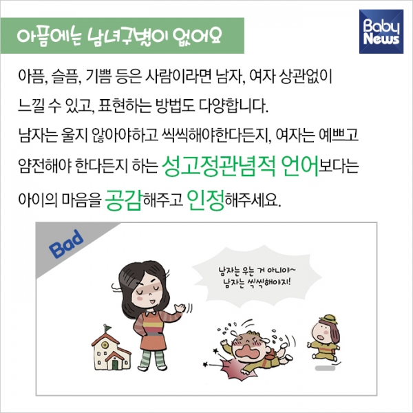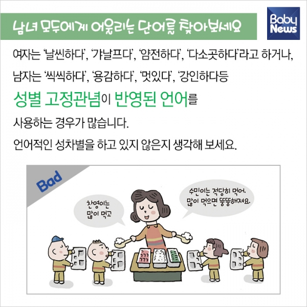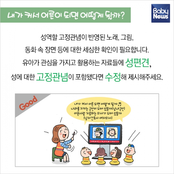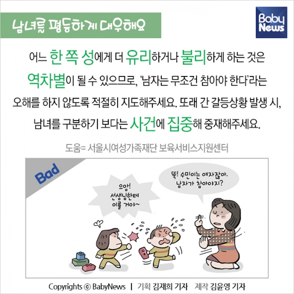 ¿µÀ¯¾ÆµéÀº ¹ß´Þ ½Ã±â·Î º¸¸é ¼º¿ªÇÒ Á¤Ã¼°¨ÀÌ ¸¸µé¾îÁö´Â ½Ã±â´Ù. ¾î¸°ÀÌÁýÀ̳ª À¯Ä¡¿øÀ¸·Î »çȸ »ýȰÀ» ½ÃÀÛÇϱ⵵ ÇÑ´Ù. ¿ì¸® ¾ÆÀ̵éÀÌ ÆòµîÇÑ ¼¼»ó¿¡¼ »ì°Ô ÇÏ·Á¸é, ¾î·ÈÀ» ¶§ºÎÅÍ ¾ÆÀ̵é ÀÚ½ÅÀÌ ¼ºÆòµîÇÑ È¯°æ¿¡¼ ÀÚ¶ó¾ß ÇÑ´Ù. ¼¿ï½Ã¿©¼º°¡Á·Àç´Ü¿¡¼ Æì³½ ¼ºÆòµî ÀÇ½Ä °³¼± °¡À̵åºÏ ¡®¼¼»ì ¼ºÆòµî, ¼¼»óÀ» ¹Ù²Û´Ù¡¯ ³»¿ë Áß °¡Á¤¿¡¼µµ ½ÇõÇÒ ¼ö ÀÖ´Â ³»¿ëÀ» Á¤¸®Çß´Ù.