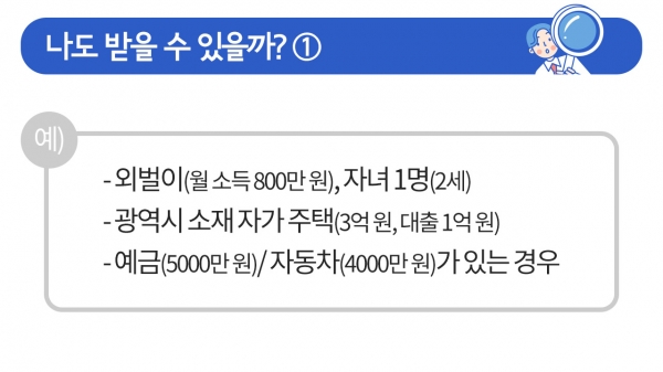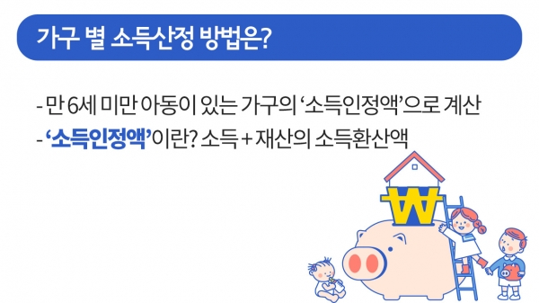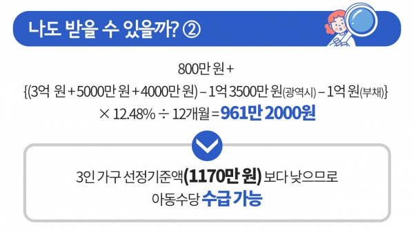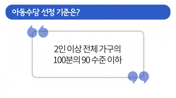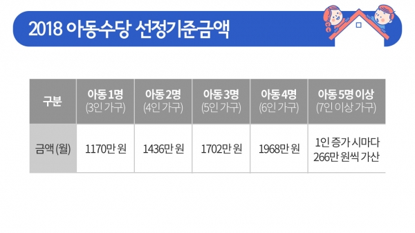 ¿ÃÇØ 9¿ùºÎÅÍ ½ÃÇàµÇ´Â ¾Æµ¿¼ö´çÀÇ ¼±Á¤ ±âÁØ ±Ý¾×ÀÌ ¹ßÇ¥µÆ½À´Ï´Ù. Àڳడ 1¸í ÀÖ´Â 3ÀÎ °¡±¸ÀÇ °æ¿ì, ¼Òµæ°ú Àç»êÀÌ ¿ù 1,170¸¸ ¿øÀ» ³ÑÁö ¾ÊÀ¸¸é ¹ÞÀ» ¼ö ÀÖ´Ù°í Çϴµ¥¿ä. ¿ì¸® ÁýÀº ¾Æµ¿¼ö´çÀ» ¹ÞÀ» ¼ö ÀÖÀ»Áö, ±Ã±ÝÇϽÃÁÒ? Áö±ÝºÎÅÍ Â÷±ÙÂ÷±Ù ¾Ë¾Æº¸°Ú½À´Ï´Ù.