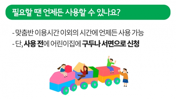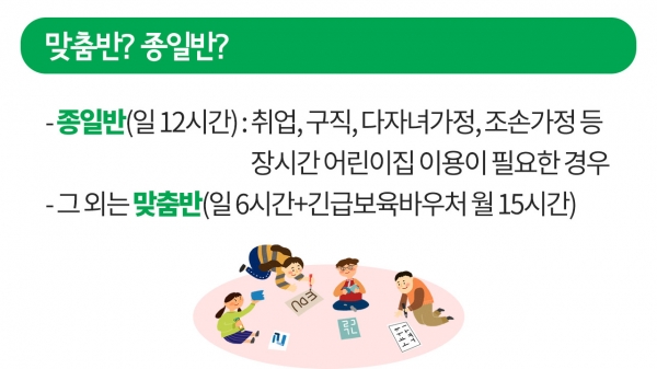 ¸ÂÃãÇü º¸À°ÀÌ ½ÃÇàµÇ¸é¼ ºÎ¸ð¿Í ¾ÆÀÌÀÇ Çʿ信 µû¶ó Á¾ÀϹÝ, ¸ÂÃã¹Ý µÎ °¡ÁöÀÇ º¸À°¼ºñ½º¸¦ ÀÌ¿ëÇÒ ¼ö ÀÖ°Ô µÆ´Âµ¥¿ä. ¾î¸°ÀÌÁý ÀÌ¿ë ½Ã°£ÀÌ ÂªÀº ¸ÂÃãÇü ¾Æµ¿ÀÇ °æ¿ì, ¸Å¿ù 15½Ã°£¾¿ º¸À°½Ã°£À» ¹«·á·Î ¿¬ÀåÇÒ ¼ö ÀÖ´Ù´Â »ç½Ç, ¾Ë°í °è½Å°¡¿ä?