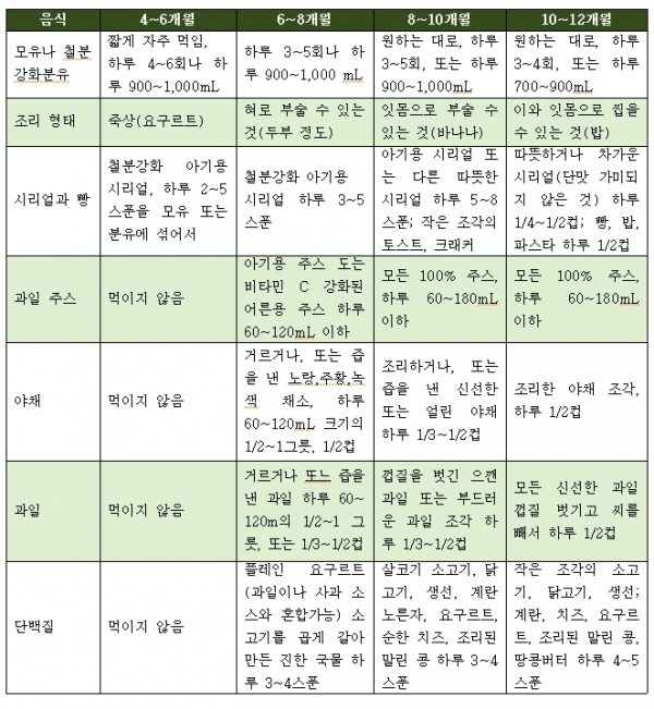ùµ¹±îÁö ¾Æ±â´Â ¿©·¯ °¡Áö ´Ù¾çÇÑ À½½ÄÀ¸·Î ½Ä»ç¸¦ ÇÏ°Ô µÉ °ÍÀÌ´Ù. ´ÙÀ½ Ç¥(»ýÈÄ Ã¹ 1³â°£ ÀÌÀ¯½ÄÀ» À§ÇÑ À½½ÄÁöħ)¸¦ º¸¸é, ÀÌ ½Ã±â±îÁöÀÇ º¸Ãæ½ÄÀº ¾ßä, °úÀÏ, ½Ã¸®¾ó, °î·ù, ´Ü¹éÁú °ø±Þ¿øÀÌ ±ÕµîÇÏ°Ô ¹èºÐµÅ ÀÖ´Ù. ù 1³â°£ Á¤»óÀûÀ¸·Î ¼ºÀåÇÏ´Â °ÍÀº ¾Æ±â °Ç°»Ó¸¸ ¾Æ´Ï¶ó ¼ºÀÎ °Ç°¿¡µµ Áß¿äÇÏ´Ù.
