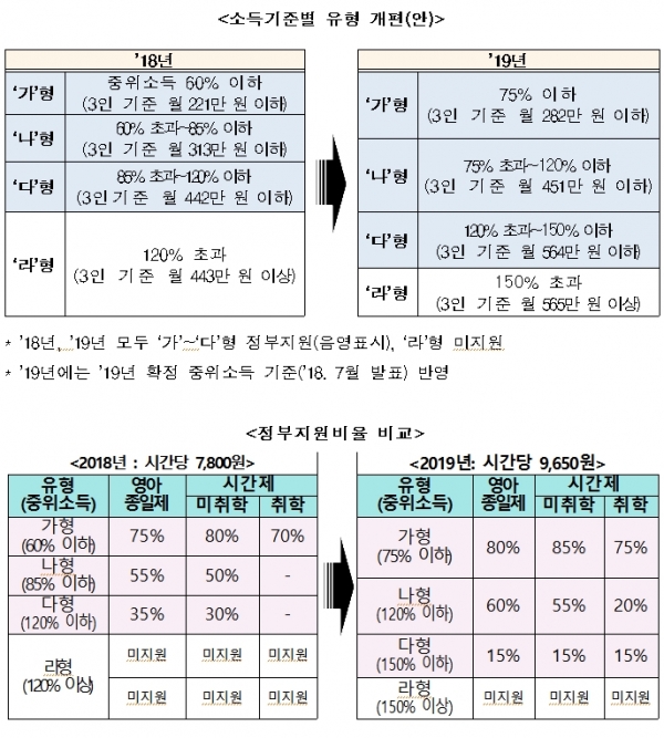 ¼Òµæ±âÁØ ¹üÀ§´Â ¡®°¡¡¯ÇüÀº ¡®ÁßÀ§¼Òµæ 60% ÀÌÇÏ¡¯¿¡¼ ¡®75% ÀÌÇÏ¡¯·Î, ¡®³ª¡¯ÇüÀº ¡®85% ÀÌÇÏ¡¯¿¡¼ ¡®120% ÀÌÇÏ¡¯·Î È®´ëµÈ´Ù. ÁßÀ§¼ÒµæÀº Àüü °¡±¸ Áß ¼Òµæ ±âÁØ 50%¿¡ ÇØ´çÇÏ´Â °¡±¸ÀÇ ¼ÒµæÀ» ¸»ÇÑ´Ù. ¿µ¾ÆÁ¾ÀÏÁ¦ ±âÁØ Á¤ºÎÁö¿ø ºñÀ²µµ ¡®°¡¡¯ÇüÀÇ °æ¿ì ¡®75%¡¯¿¡¼ ¡®80%¡¯·Î, ¡®³ª¡¯ÇüÀÇ °æ¿ì ¡®55%¡¯¿¡¼ ¡®60%¡¯·Î »óÇâµÈ´Ù.