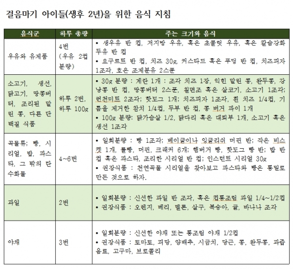 °ÉÀ½¸¶±â ¾ÆÀ̰¡ ¸Ô´Â °ÍÀº ºÎ¸ð°¡ º¸±â¿¡ È¥¶õ½º·´´Ù. ±×·¯³ª ´ëºÎºÐÀÇ ¾ÆÀÌ´Â ÇÏ·ç Á¾ÀÏ Æò±Õ Çʿ䷮À» ¼·ÃëÇÑ´Ù. ´ÙÀ½¿¡ ³ª¿À´Â Ç¥´Â ÇÏ·ç¿¡ °ÉÀ½¸¶±â ¾ÆÀ̵éÀÌ ¸Ô´Â ¿©·¯ °¡Áö À½½Ä¿¡ ´ëÇÑ ÀϹÝÀûÀÎ ÁöħÀÌ´Ù.