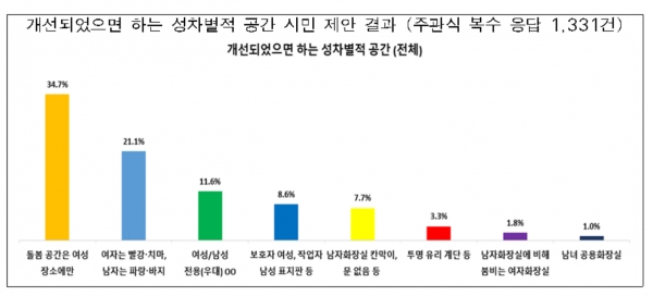 ³²³à ¸ðµÎ ¹Ù²Ù°í ½ÍÀº ¼ºÂ÷º°Àû °ø°£À¸·Î ¡®¿©¼º °ø°£¿¡¸¸ ÀÖ´Â ¾ÆÀ̵¹º½½Ã¼³¡¯(34.7%)À» °¡Àå ¸¹ÀÌ ²Å¾Ò´Ù. ¡ã¿©¼ºÀº ºÐÈ«, ³²¼ºÀº ÆÄ¶ûÀ¸·Î Ç¥ÇöµÈ °ø°£(21.1%) ¡ã¿©¼º¡¤³²¼º Àü¿ë(¿ì´ë) °ø°£(11.6%) ¡ã¿©¼ºÀº º¸È£ÀÚ, ³²¼ºÀº ÀÛ¾÷ÀÚ µî ¼º¿ªÇÒ °íÁ¤°ü³ä Ç¥ÁöÆÇ(8.6%) ¡ã°³¹æµÅ »ç¿ëÇϱ⠹θÁÇÑ ³²ÀÚ ÈÀå½Ç(7.7%) µîÀÇ ÀǰßÀÌ À̾îÁ³´Ù.