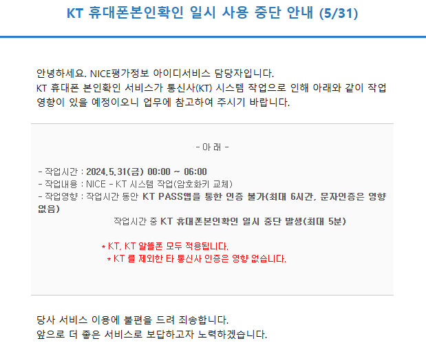[NICEÆò°¡Á¤º¸] KT ÈÞ´ëÆùº»ÀÎÈ®ÀÎ ÀϽà »ç¿ë Áß´Ü ¾È³» (5/31 0:00~06:30)