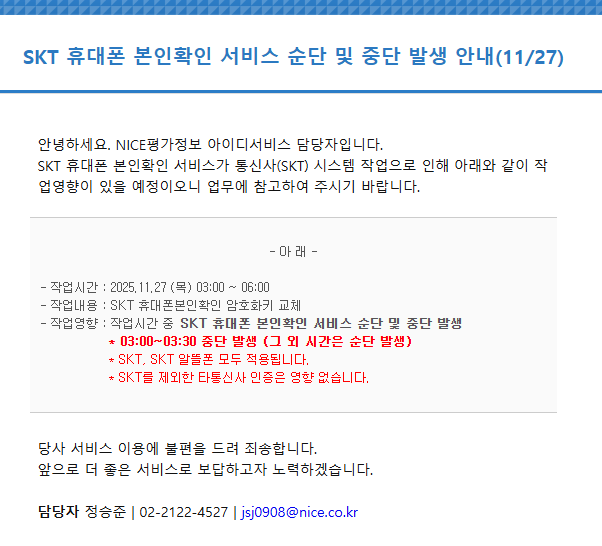 SKT ÈÞ´ëÆù º»ÀÎÈ®ÀÎ ¼ºñ½º ¼ø´Ü ¹× Áß´Ü ¹ß»ý ¾È³»(11/27)