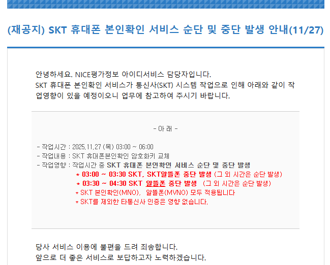 [NICEÆò°¡Á¤º¸] (Àç°øÁö) SKT ÈÞ´ëÆù º»ÀÎÈ®ÀÎ ¼ºñ½º ¼ø´Ü ¹× Áß´Ü ¹ß»ý ¾È³»(11/27)