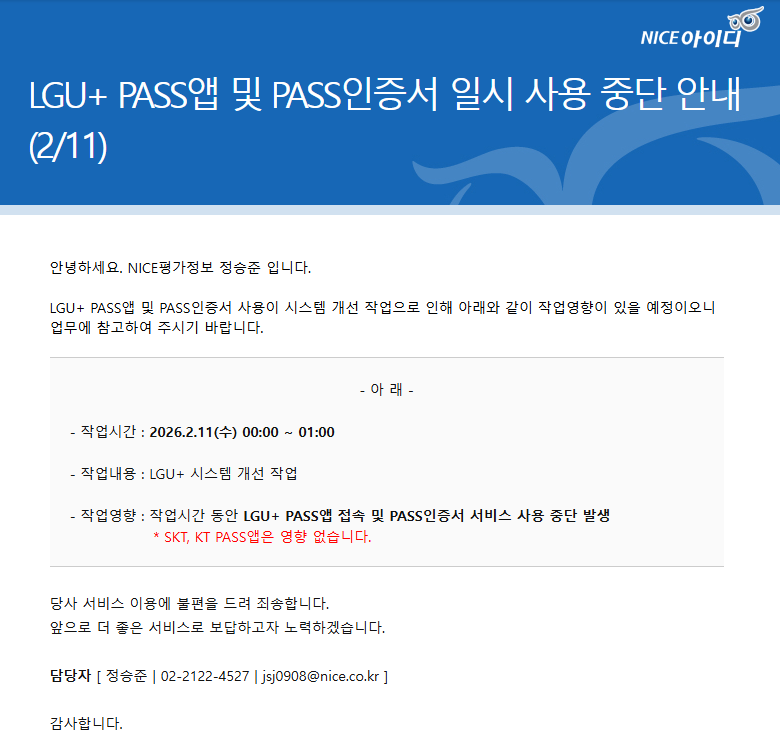 [NICEÆò°¡Á¤º¸] LGU+ PASS ¾Û ¹× PASS ÀÎÁõ¼ ÀϽà »ç¿ë Áß´Ü ¾È³»(2/11) »õâÀ¸·Î Àбâ