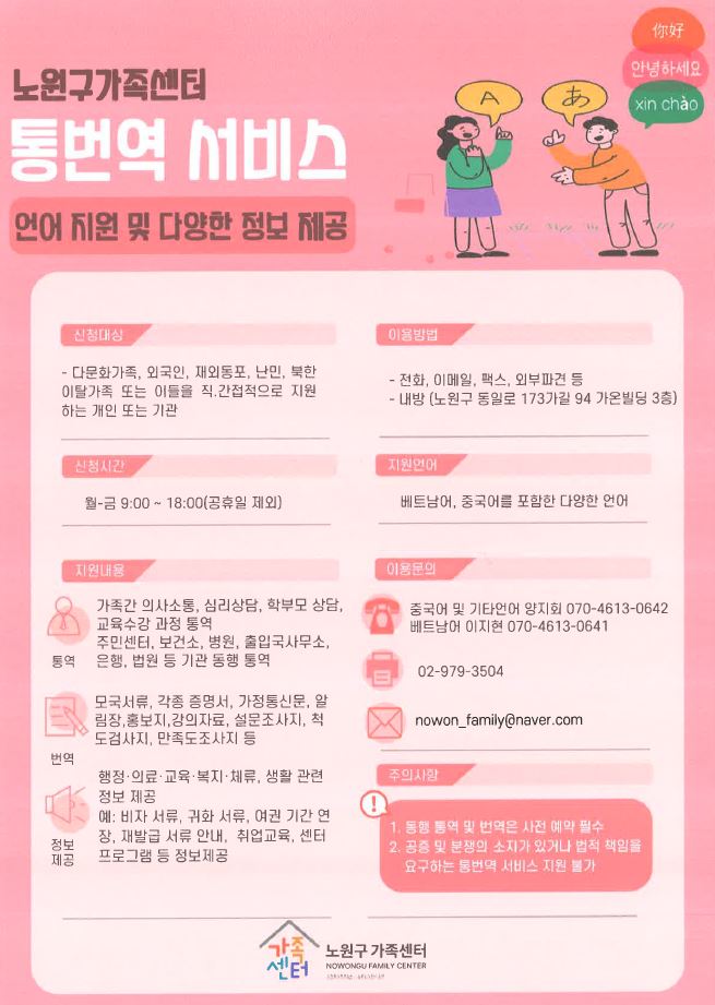 ³ë¿ø±¸ °¡Á·¼¾ÅÍ¿¡¼ °áÈ¥À̹ÎÀÚ Åë¹ø¿ª¼ºñ½º¸¦ »ó½Ã Á¦°øÇϰí ÀÖ½À´Ï´Ù.